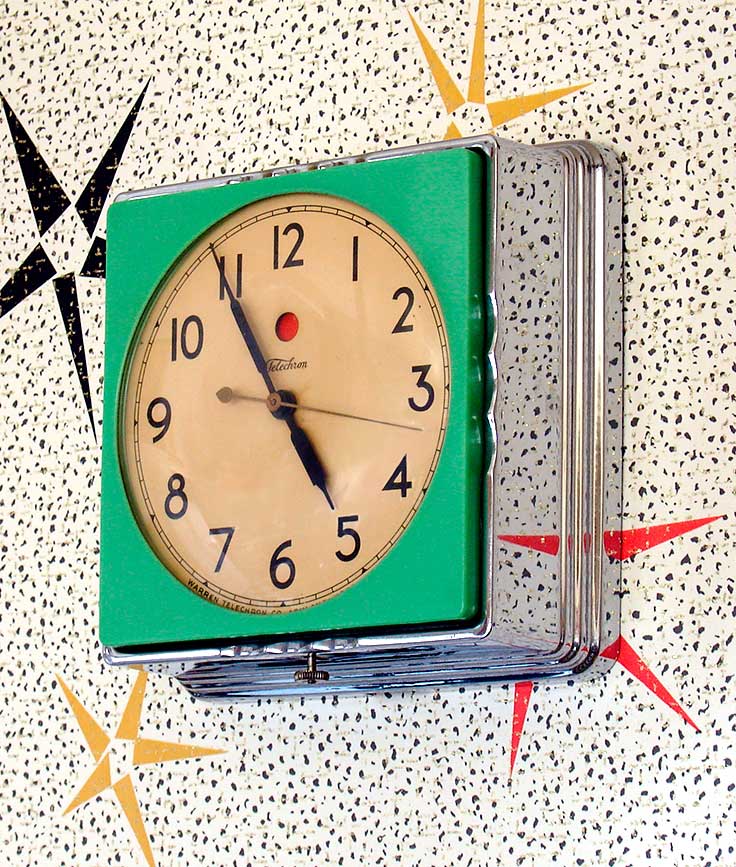 And below it is a green plastic and chrome metal Telechron kitchen clock from around 1940. This electric clock, marked Warren Telechron Co. (USA), predates GE’s takeover of that firm. It’s likely that the Telechron design people are responsible for the stylishly-designed GE clocks of the ’50s and ’60s, like the red one here, before GE management put a stop to it.