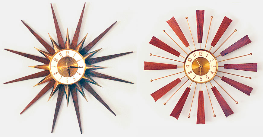 Two of my favorite clocks are the starburst, or spike, clock (c.1950s) seen here and the ball clock (1947). These are the real deal from Howard Miller Clock Co. (USA), design credited to George Nelson. These gorgeous clocks were knocked off (copied) dozens, maybe hundreds of times by lesser makers and you can see a couple of examples at the bottom of this page. Most of these rip-offs are truly hideous like the left one in that photo; some, like the right one, aren’t too bad. No one ever got close to equaling the design of the originals.