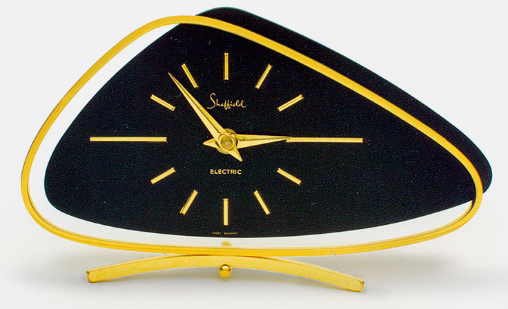 The beautiful black & gold Sheffield table clock is battery powered and from Germany c.1960s. In the photo of three more table clocks, at left is the wind-up Clock of Tomorrow by Westclox (1955, USA). Next is a delightful clock that reminds me of a 1950s Chevrolet emblem. It’s a wind-up Rhythm “Auto Calendar Alarm Clock” (c.1958, Japan). And at right is the fun Blessing wind-up alarm clock from West Germany, c.1960.