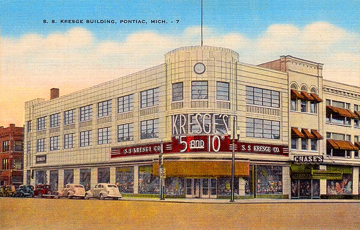 See the before & after pictures at the top. The several incarnations of this structure have each sunk to new depths even while ostensibly “improved.” It is good that it now houses medical offices because I am feeling sick. As you see in the “before” picture, it began as a showplace location of Kresge’s 5 and 10 cent store (the S. S. Kresge company—the folks who later put the ‘K’ in K-Mart). It was on the main intersection of one of the fastest growing cities in America. It is still the main intersection of that town. As in a lot of bad planning and politics, efforts and money are put into new and higher structures of chrome and glass for the power elite (notice the skyline behind) rather than down where the regular folks live. We’re talking Pontiac, Michigan, folks, a town with more scapegoats for its decline than it has population. But a short drive down Woodward Avenue to the cute little town of Birmingham puts the lie to most of them. Birmingham embraced its town as it was. Pontiac tried to make its town into Detroit.