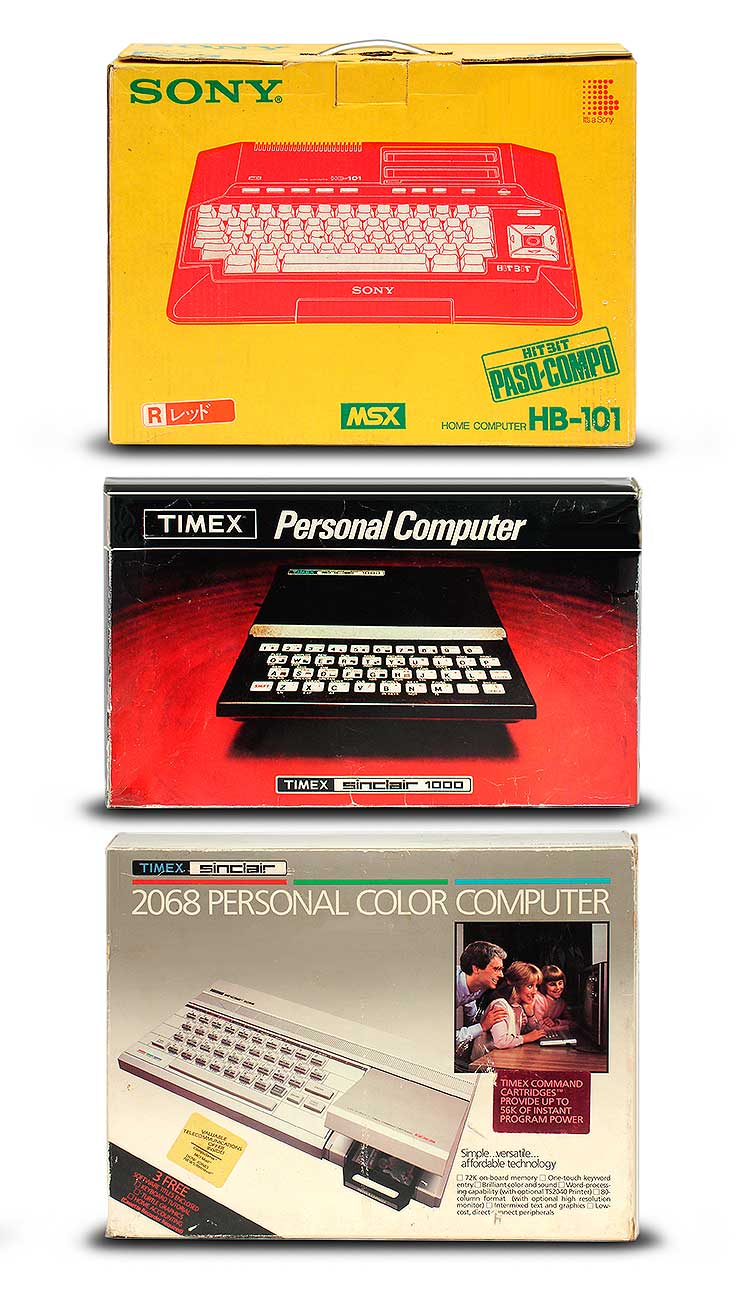 And here in silver is the Timex Sinclair “2068 Personal Color Computer” made in Korea by Timex Computer Corporation. The black one below it is the Timex Sinclair 1000, made in Portugal. Yes, Portugal. The white Sinclair ZX80 from England (1980) was offered as a kit. These last two employ so-called membrane keyboards, the same sort of annoying imitation push-buttons they put on your microwave oven to save money. How anyone could type on that is beyond me.