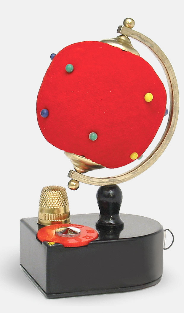 And here’s the goofy Current NP-81 Pincushion Radio. It’s not only a radio, it’s also an actual pincushion stuck with real pins, and it has a thimble and built-in retractable tape measure you can see peeking out on the right.