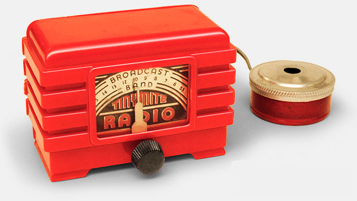 The beautiful red Tinymite you see here is from the prolific Western Manufacturing of Kearney, Nebraska (1949) who sold their wares through little mail-order ads in popular and hobbyist magazines. They made a lot of interesting crystal radios and some tube and transistor radios too. They even made some walkie-talkies. You don’t see this X-50 Space Helmet Radio every day, now do you? Man! It’s “For Young Moon Travelers” and it’s from Hearever (USA). Very few of these were made.