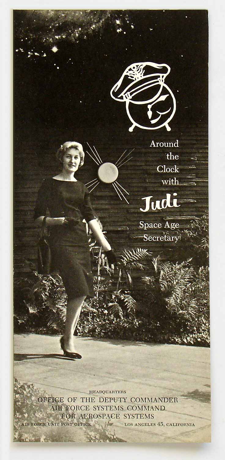 Around the Clock with Judi, Space-Age Secretary shows Judi at her new job and describes all that awaits her in her “space age future.” This brochure extols the virtues of Southern California as it attempts to lure women to work for the Air Force in one of 25 “college-campus-like” office buildings in the high-tech South Bay area. From the Office of the Deputy Commander, Air Force Systems Command for Aerospace Systems, Los Angeles.