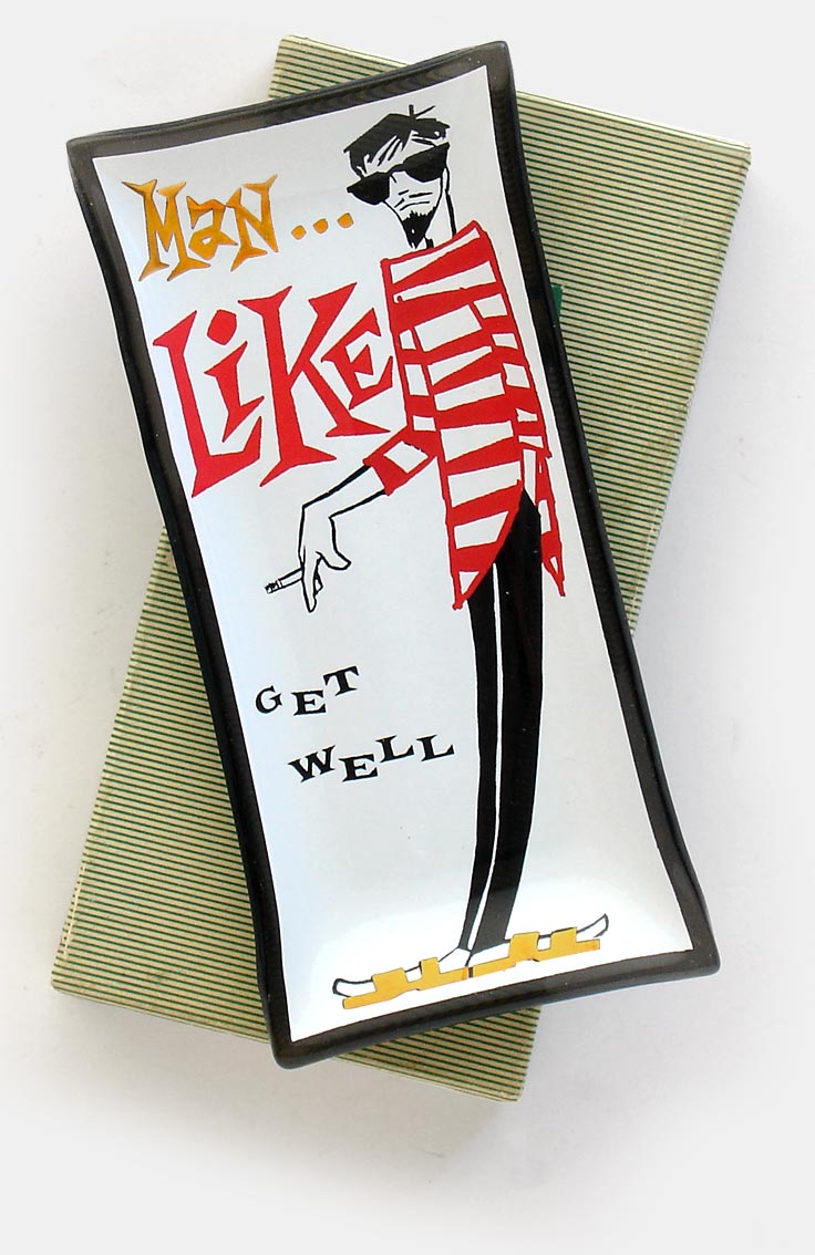 Man...Like, Get Well. Early 1960s. Ah, the beatnik and the ascendency of the word “like” to the supreme status of appearing in nearly every sentence uttered by nearly every American in the last 60 years. I like to think it originated in beatnik poetry readings where reader and audience alike affected a kind of “speaking in simile,” as if their conversation, indeed their whole lives, was poetry. Nearly everything said could be “like” something or other. And it was! Like, wow! This six-inch long get well ash tray was sold in a gift box which says “A Houze Art Product” on it.