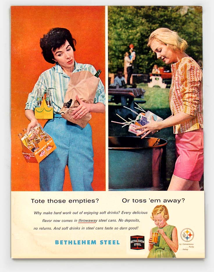 In this 1950s magazine ad, Tote those empties? Or toss ’em away?, two housewives wrestle with the thorny question of what to do with the beverage containers their loving charges have emptied. The idiot on the left is stuck with the task of returning to the store those nasty reusable glass bottles she so stupidly bought, while the smarter, blonder, housewife just sends all her steel cans to the landfill where someone else can worry about them.