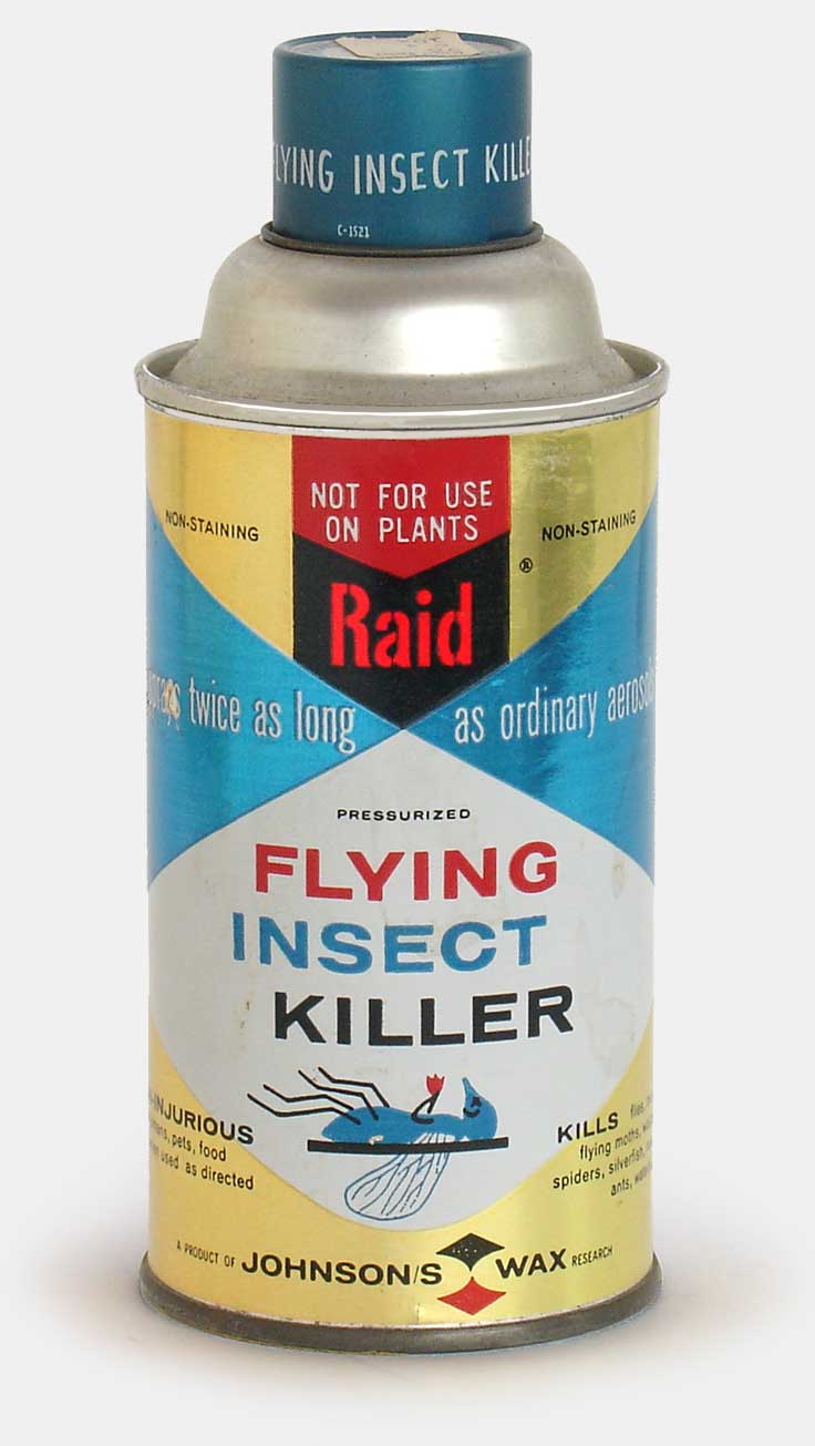 Raid Pressurized Flying Insect Killer from Johnson’s Wax, c. 1960s. Not often thought of as a disposable item because it may contain enough for several uses, nevertheless the aerosol can is indeed a single-use item because it can’t be refilled. It replaced manual, refillable, hand sprayers.