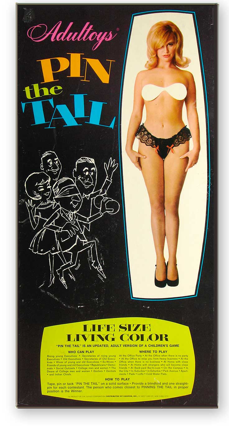 Along the same remarkable lines as Chicks and Checkers there’s Pin the Tail (Adultoys, c.1970) which consists of several sets of breasts (yes, really, breasts) which blindfolded—and presumably drunk—partygoers attempt to pin into position on a life size ‘paper doll.’