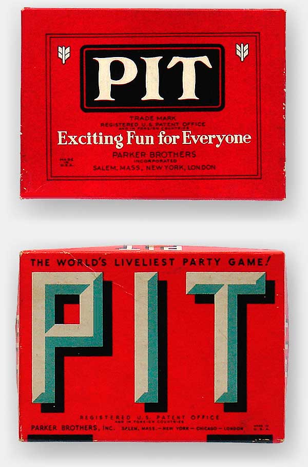 Game makers were notorious box-changers. Many would change the design of the box annually, sometimes with even greater frequency. These changes were made to make the game seem new or somehow different so the enthusiast would buy it again. Now, of course, they do this even more brazenly, issuing different “editions” to the gullible with tie-ins to movies and such. Quaint by comparison, we see here another couple of versions of Pit, the one on top being from the 1940s and below it still another Pit from about 1958.
