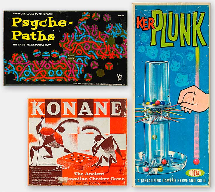 Psyche-Paths is from Funtastic and this one is dated 1969. The action-packed Ker Plunk (Ideal, 1967), looks like fun and bills itself as “a tantalizing game of nerve and skill.” And Konane is “the ancient Hawaiian checker game” (Anekona Hawaii, c.1967).