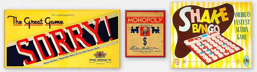 Sorry “The Great Game” was also a quite frustrating game for those who attempted to bring skill to a game that was almost entirely chance (Parker Brothers, 1934, this edition 1950). Monopoly (Parker Brothers, 1936. Everybody knows Monopoly. This edition is from sometime in the 1950s before board and pieces all came in one large box. Here we see the smaller box which did not hold the board but only the player pieces, cards, houses, hotels, and of course money. Shake Bingo, “America’s fastest action game” (Schaper, c.1959).