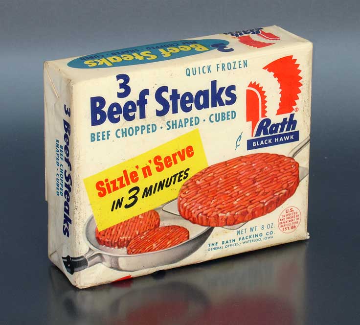 My parents would have had nothing to do with the Quick Frozen 3 Beef Steaks by Rath Black Hawk. Most convenience foods were frowned upon, especially uncooked meat you couldn’t see. I say “parents” but really I mean my mother. On those rare occasions my father “cooked,” it was the one thing he knew how to do on a stove: rice. In a bowl with milk, brown sugar, and cinnamon, of course!
