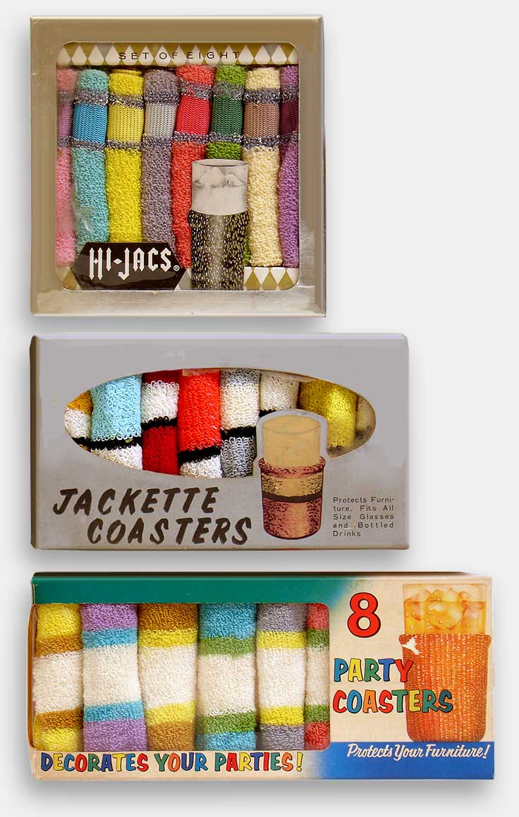 The lowly coaster got a rethink in the mid-20th century. Several makers got on board: Hi-Jacs “King of Coasters.” The Hi-Jac Corporation, Chattanooga, Tennessee. “Keeps Ice Longer, protects your fine furniture, wonderful to hold.” Wonderful.