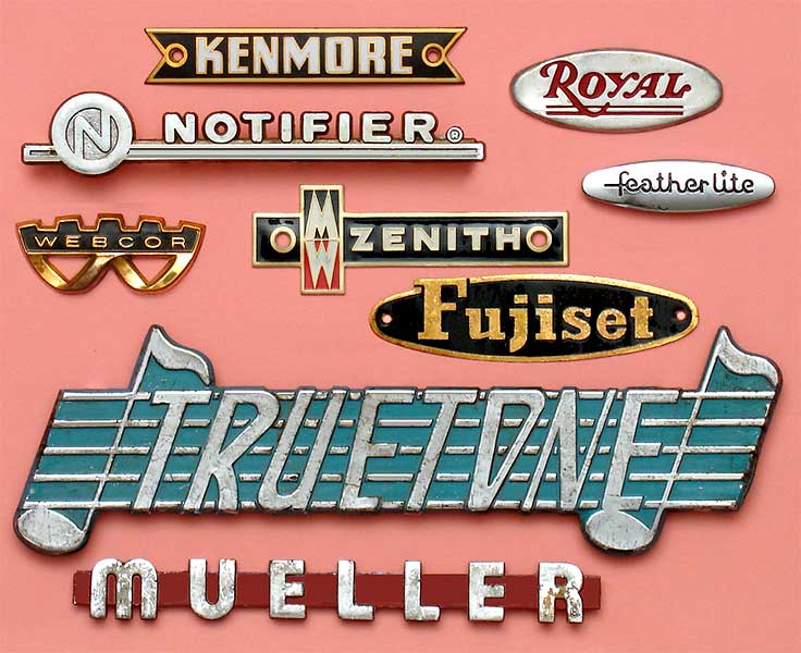 The Planet, Kenmore, and Zenith cloisonné badges are from sewing machines. The Webcor and Truetone badges are off of electronic sound equipment. Truetone was a brand of Western Auto Stores.