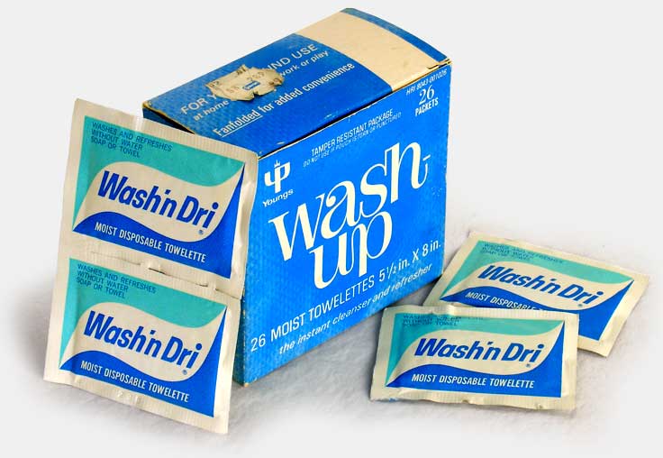 When I found these disposable towelette things I call, generically, “handy wipes,” I thought wow, these are pretty old. The blue box contains “Wash-Up, 26 Moist Towelettes.” The box describes them as “The instant cleanser and refresher.” There is a UPC code on the bottom but it must have been added in a later printing of this 1965 box. (The UPC code didn't come into use until the 1970s.) Youngs Drug Products Corporation, New Jersey. The loose packets are Wash'n Dri Moist Disposable Towelettes. "Washes and refreshes without water, soap, or towel. From Canaan Products, a subsidiary of Colgate-Palmolive.