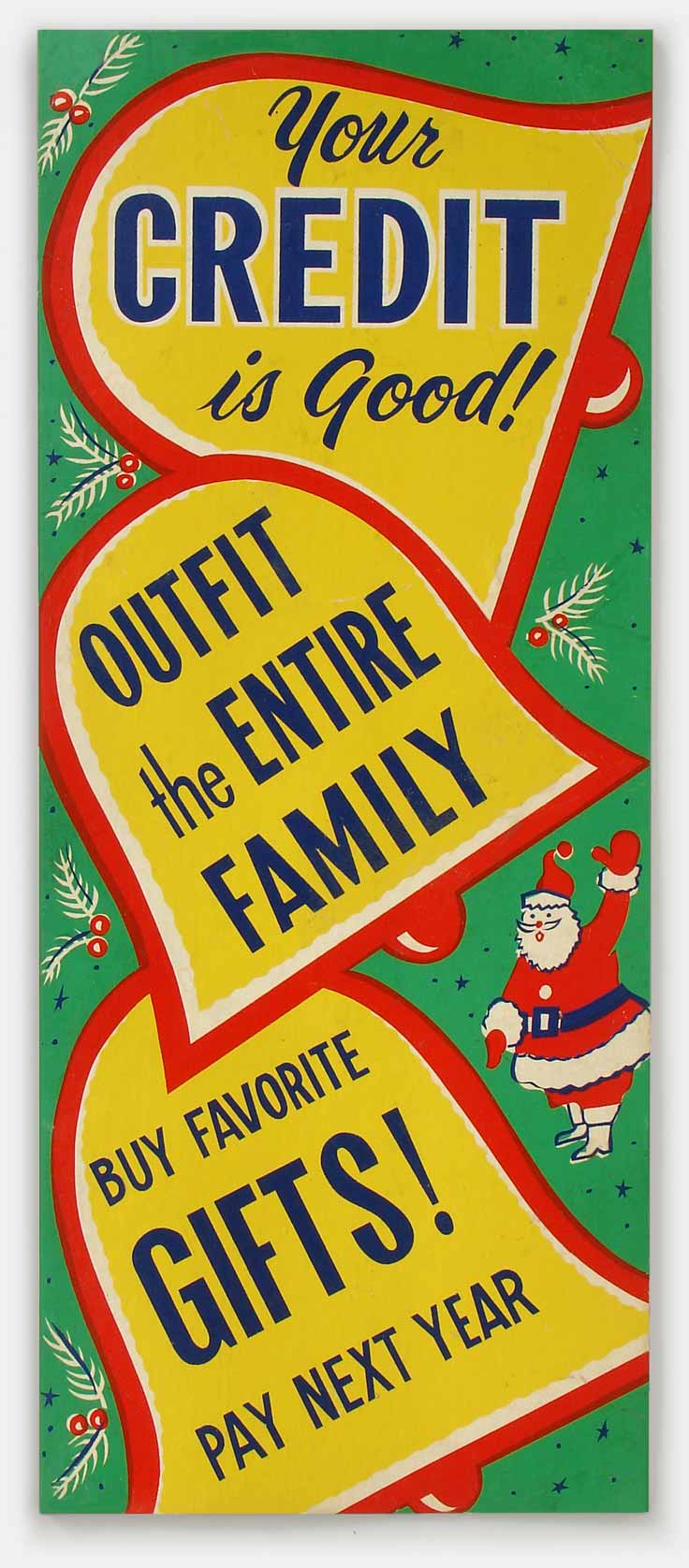 The vintage silk-screen store placard from about 1960 shows us that our “consumer culture” is no recent phenomenon. Your Credit is Good! (even if it isn’t), Oufit the Entire Family, Buy Favorite Gifts! Pay Next Year. Easy credit indeed. Spend, spend, spend! And “pay next year” sounds a long way off, but from the appearance of Santa Claus on the poster, I think your payments “next year”may come sooner than you think, like next month.