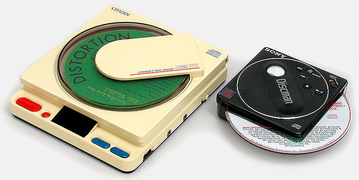 The portable CD player was a while getting off the ground. Early ones like this Citizen and dangerous-looking but impressively-small Sony Discman ate power voraciously. That’s one reason why these early models didn’t even have on-board batteries but rather had larger, detachable battery packs. And that’s why though “portable,” most people used them plugged into a wall socket. This Citizen is a model CPM 777 (1988, Japan) and measures 5-7/8" by 6-3/4"; the Sony D-88 (1988, Japan) measures about 3-3/4" square and 1-1/4" thick.