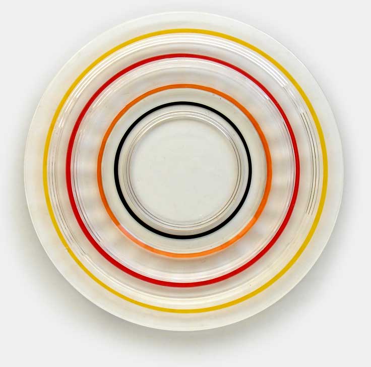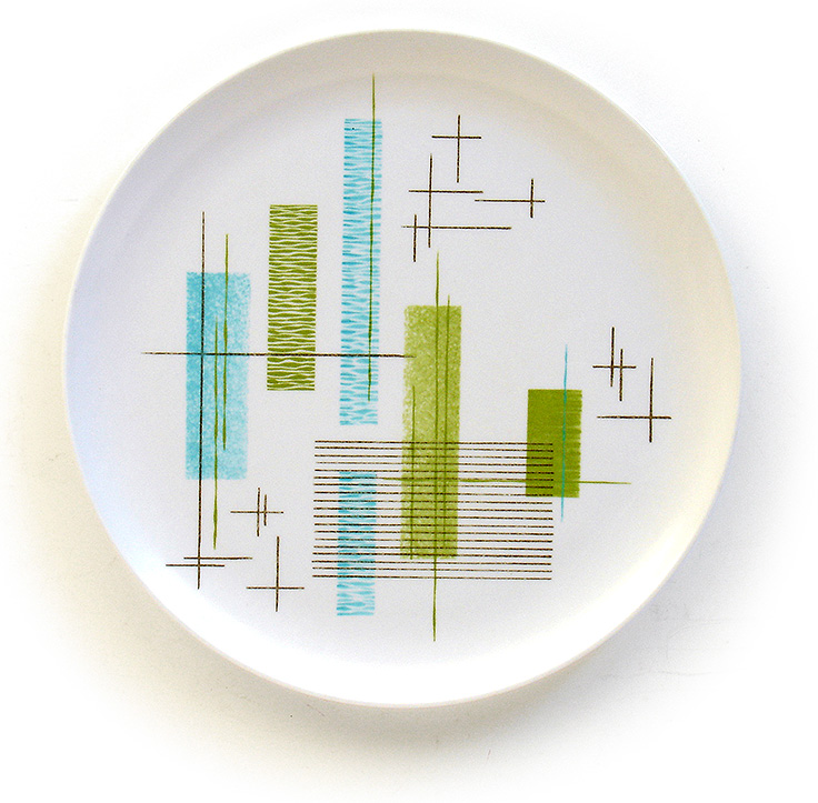 The abstract plate in the nice greens and blues is a mid-century modern 9-5/8 inch plastic plate marked on the back with only this: 303, a small ‘3’ under that, and Los Angeles, Calif.