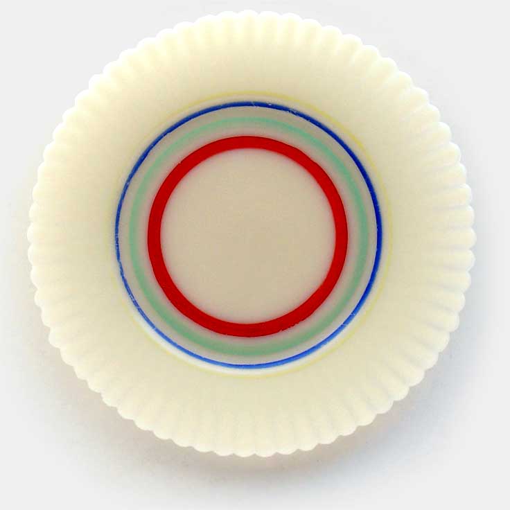 The crescent-and-star-pattern plate is made of plastic and is from Spaulding Ware Chicago. It’s 9 inches across. I have never found more than two of these together and every time I see another example of this plate the pattern on it is somehow different.