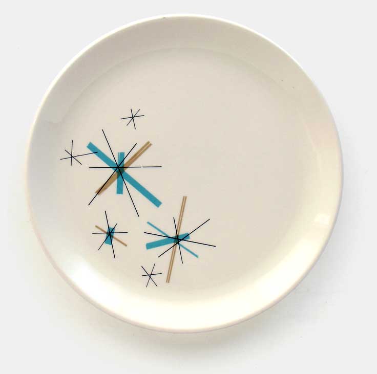 as seen on the turquoise, gold, and black asterisk figures (stars) that adorn two of the last plates shown here. The large one says Salem Ovenproof 61 U on the back and is 10 inches, the small one is 6-1/4 inches and is unmarked.