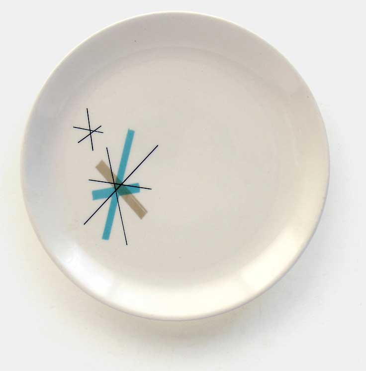 While the design is, to me, just a little bit stiff, I do still like the 7-1/4 inch plate with the 4-pointed stars in browns and blue. It says “Trend Syracuse..China 97-J U.S.A.”